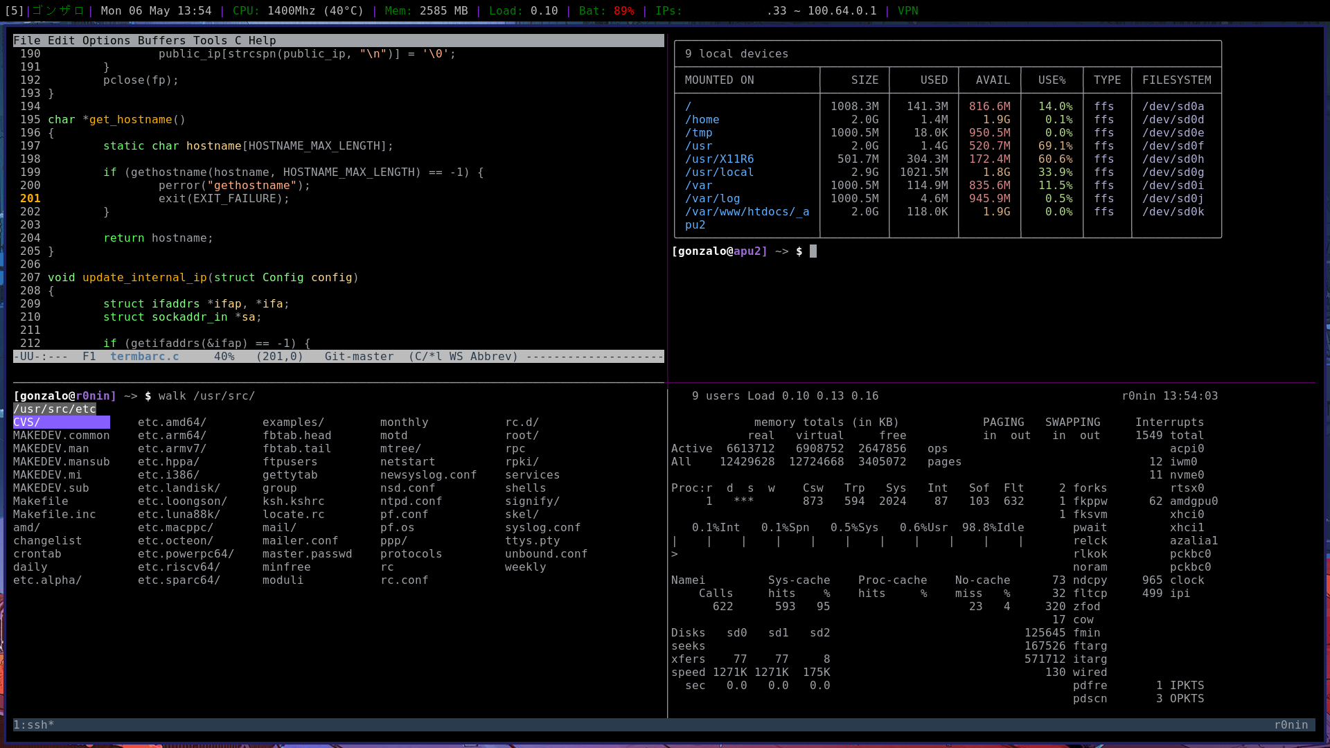 As a final note, I saw a lot of people following tutorials on "OpenBSD Desktops" that changed a lot of flags totally blindly without any real test or comparison after/before. About this, I would say that my user is part of the staff and I didn't change anything in the login class, and also my sysctl.conf(5) is the default with the normal changes like machdep.allowaperture=2 (Update: tb@ made me realize that machdep.allowaperture is not needed anymore, thanks!) or net.inet.ip.forwarding=1, my daily laptop is a thinkpad x395.