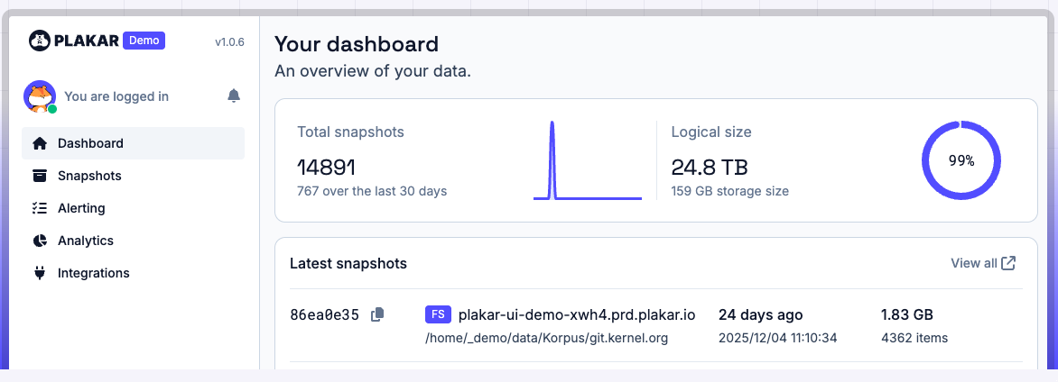 Pretty fast, no? The backup is done — that was just a simple backup run by hand, but you can schedule backups (https://plakar.io/docs/v1.0.6/guides/setup-scheduler-daily-backups/), exclude files from them (https://plakar.io/docs/v1.0.6/guides/excluding-files-from-a-backup/), serve a kloset store over HTTP (https://plakar.io/docs/v1.0.6/guides/serving-a-kloset-store-over-http/), or use one of my favorites that I didn't expect to have: a very nice UI to manage the whole thing (https://plakar.io/docs/v1.0.6/references/commands/plakar-ui/), that you can use with something like: